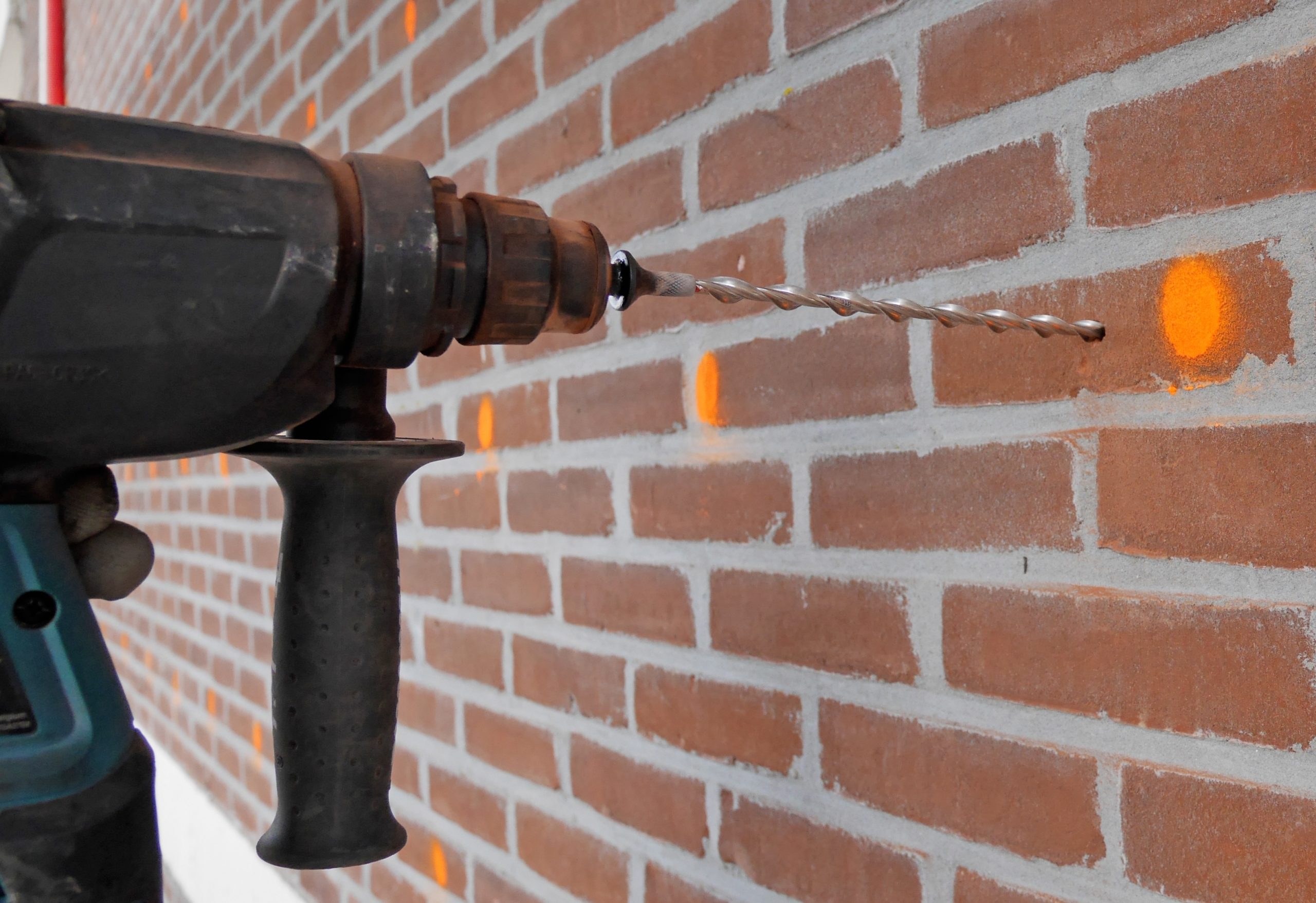 Voor het verbinden van het buiten- en binnenblad maken wij gebruik van het gepatenteerd renovatie spouwanker van Thor Helical. Het anker is van de hoogste RVS kwaliteit 316 en door SKG-IKOB gecertificeerd als ‘Erkend Renovatiespouwanker’. Na het uittekening van het ankerpatroon op de gevel, worden de ankers snel en eenvoudig door een SDS tool met hamerslag in een voorgeboord gat aangebracht. Hier volgen met regelmaat controlemetingen op, zodat afwijkingen in het binnenblad tijdig geconstateerd kunnen worden.