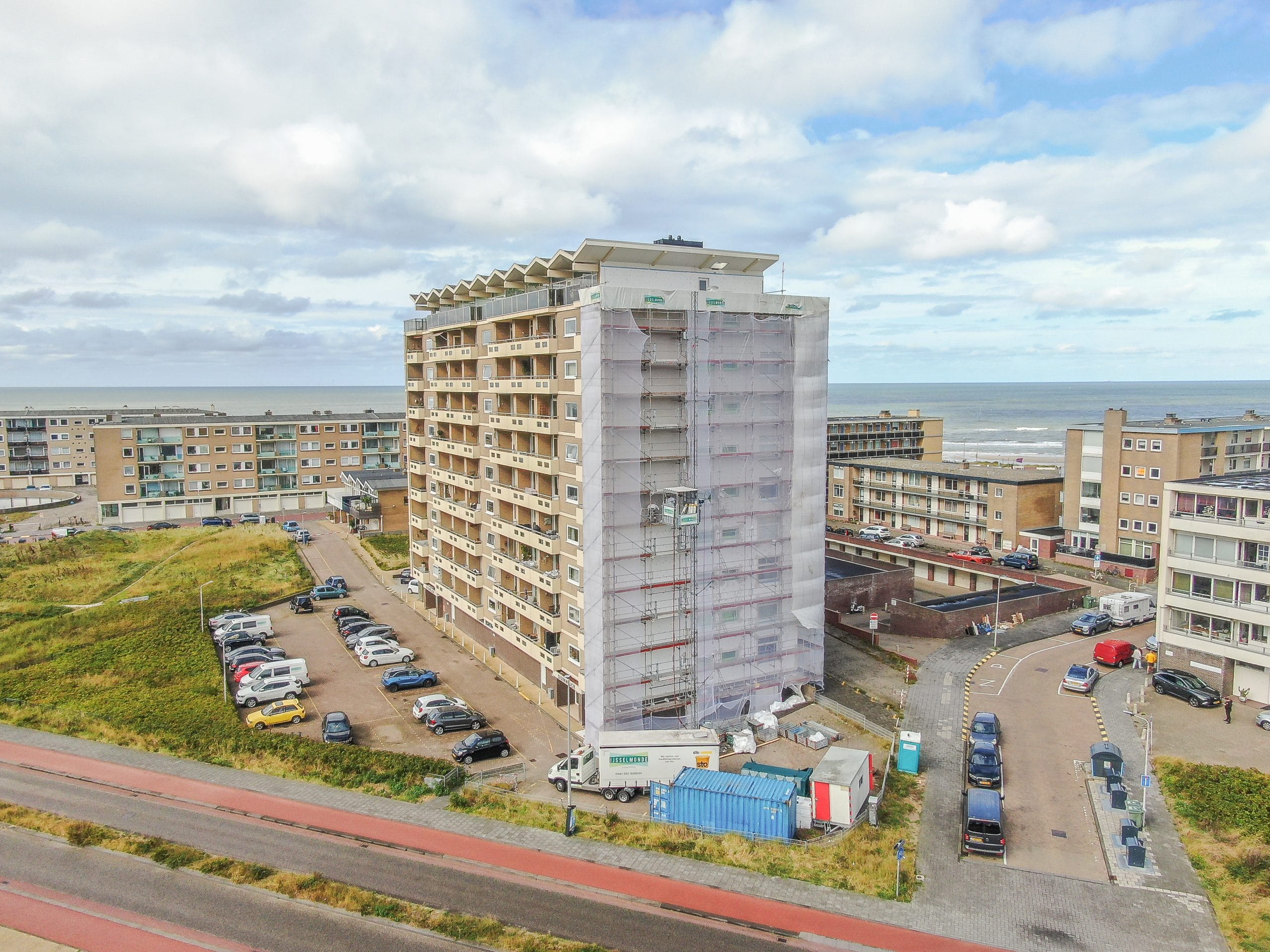 Met trots presenteren wij de nieuwste film over het bijzondere bouwproject in Zandvoort. Self-supported hebben wij dit project binnen zeer korte tijd gerealiseerd. Dit kon doordat wij het steigerwerk compleet in eigen beheer hadden en korte lijntjes hebben met onze waterslagen leverancier Alusystemen. Zij hebben de waterslagen ingemeten, geleverd en geplaatst voordat de buitengevelisolatie van Sto Nederland werd aangebracht.